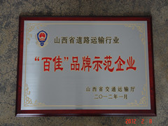 2012年2月8日,在山西省道路運(yùn)輸工作會(huì)議上,我公司獲得由山西省交通運(yùn)輸廳頒發(fā)的山西省道路運(yùn)輸行業(yè)《“百佳”品牌示范企業(yè)》榮譽(yù)稱號。